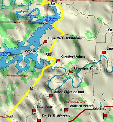 In February of 1873, Jesse Veale was the last victim of an Indian attack on the mouth of the Ioni in Palo Pinto County. Citizens searched the countryside around Bluff Creek and the Belding Ranch, discovering Veale's body as well as those of two Indians that had been his victims in the fight. In the process, they encountered a band of warriors who gave them a good fight, causing some injuries. The Indians took refuge in a cave as darkness fell. They guarded the entrance through the night and the men made a charge the next morning, only to find the raiders had escaped.
