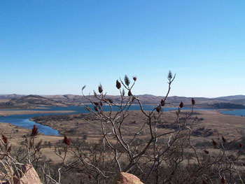 Hwy. 281 to Wichita Falls is another good route to Fort Sill. For more detailed information, see the Red River road trip. Just beyond the Y to Jermyn lies a roadside park on the west side of the highway offering a terrific view of Lost Valley. The missing historical marker once read: