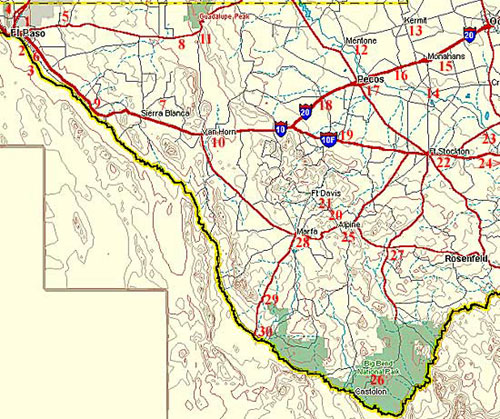 Alpine | Anthony | Balmorhea | Big Bend | Castolon | Fort Bliss | Fort Davis | El Paso | Fort Stockton | Girvin | Grandfalls | Iraan | Lajitas | Marathon | Marfa | McNary | Mentone | Monahans | Pecos | Presidio | Pyote | Salt Flat | San Elizario | Shafter | Sheffield | Sierra Blanca | Socorro | Toyah | Van Horn