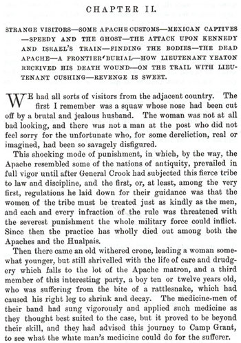 Strange Visitors | Some Apache Customs | Mexican Captives | Speedy and the Ghost | The Attack Upon Kennedy and Israel's Train | Finding the Bodies | The Dead Apache | A Frontier's Burial | How Lieutenant Yeaton Received His Death Wound | On the Trail with Lieutenant Cushing | Revenge is Sweet Ranch |